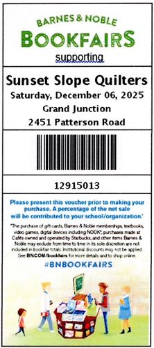 Our Barnes & Noble Book Fair will be Saturday, Dec. 6 all day! A portion of all purchases will be donated to SSQ and shoppers will be treated to a mini Quilt Show entitled "My Favorite Color" with works by SSQ Members. Send the voucher to friend and family as it can be used in any B&N worldwide on December 6! Be sure to print on off of this website for yourself!